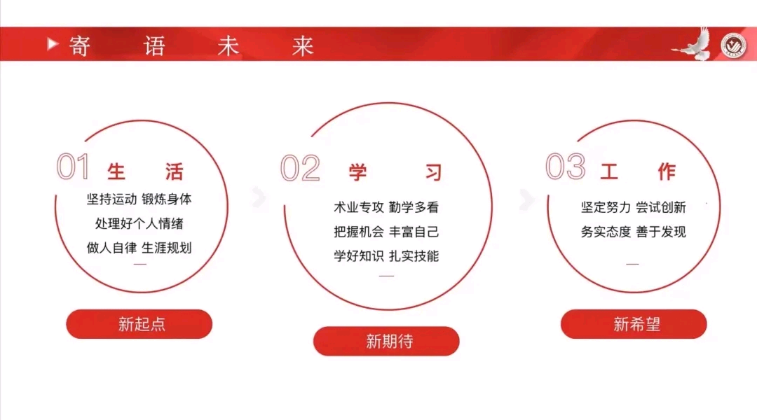 大学是知识的海洋,是梦想和实现梦想的地方。希望大家做到:自觉、自省、自律、自强,充实自己,不断提升自己,才能实现梦想。